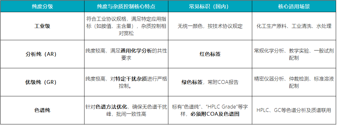 工业级、分析纯、优级纯、色谱纯试剂有何区别