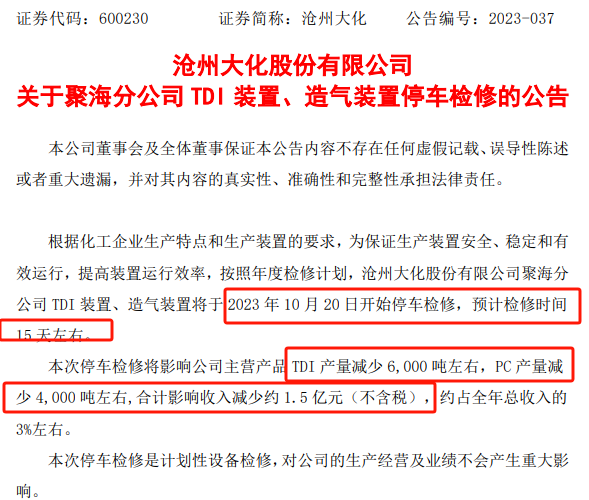 据公开信息显示,目前已有涉及ABS、甲醇、TDI等多个产业链,事关超1300万吨产能。部分如沧州大化的巨头,停车检修将累计减少一万吨产能,合集影响说如减少月1.5亿。